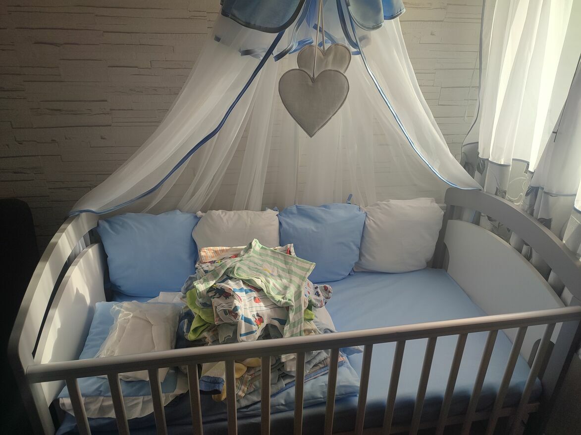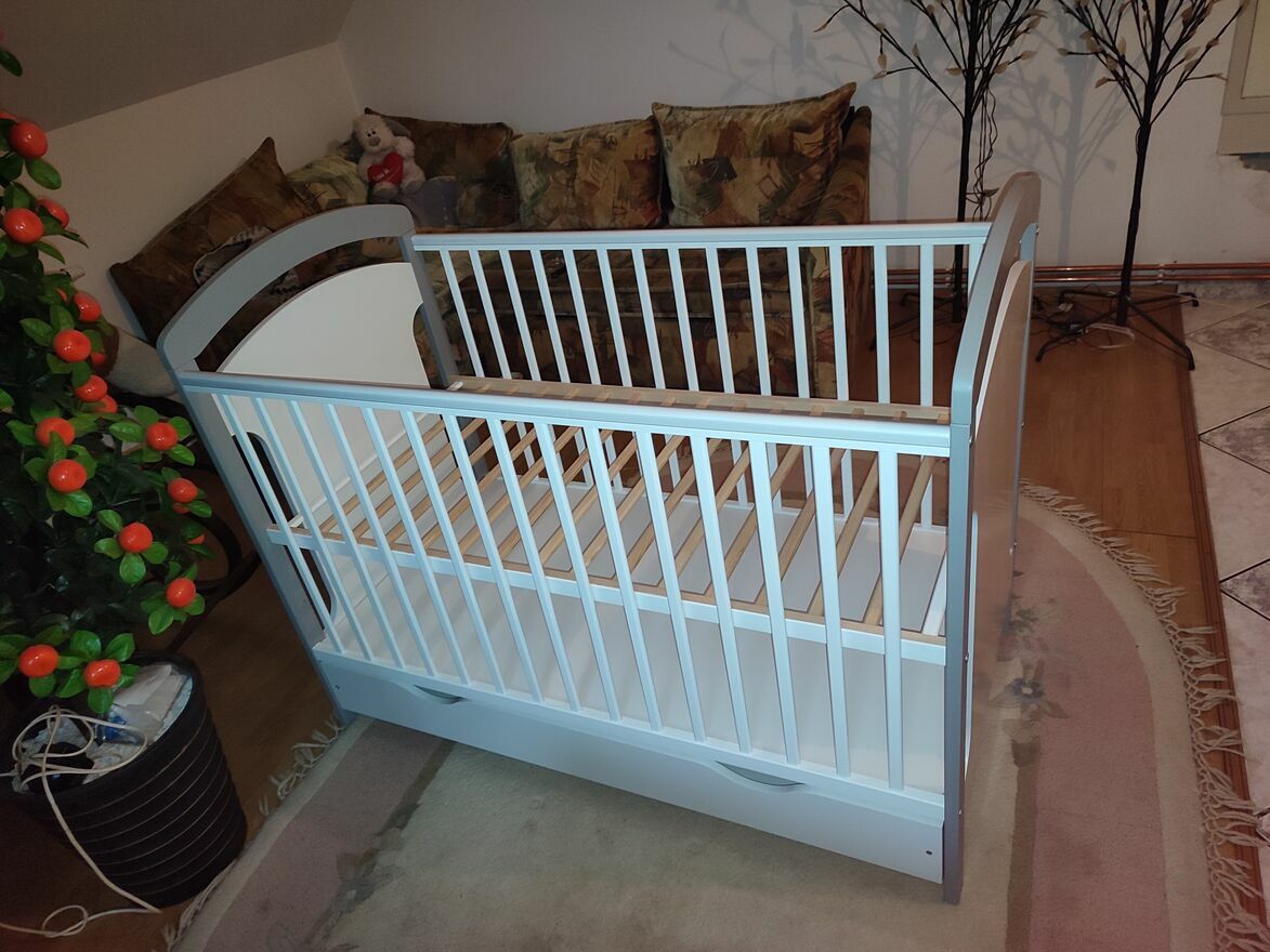 Sprzedam łóżeczko dziecięce w bardzo dobrym stanie. Dziecko spało w nim moze z trzy razy. Łóżeczko posiada materac kokos pianka,baldachim. W pozniejszym czasie mozna przerobic na tapczanik. Niestety poduszek ochronnych nie posiada ale dorzucam od siebie za poduszki warkocz w kolorze niebieskim ochronny. Nie posiada szuflady.Weronika